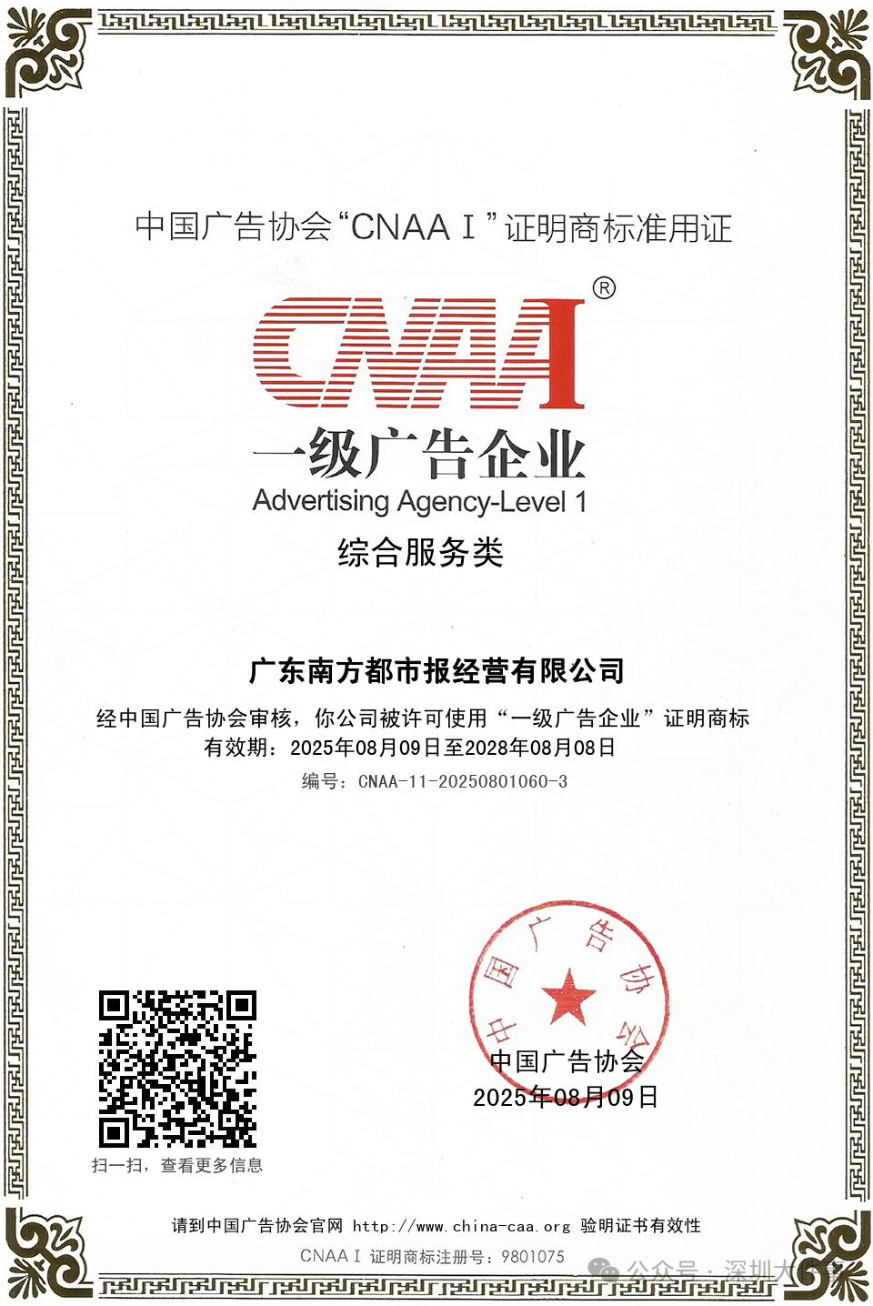 2025年8月,经中国告白协会审核,广东南边王人市报谋略有限公司被授予“一级告白企业·笼统服务类”解说商标,踏进中国一级告白企业行列,为中国49家一级告白企业(笼统服务类)中独一机构媒体。