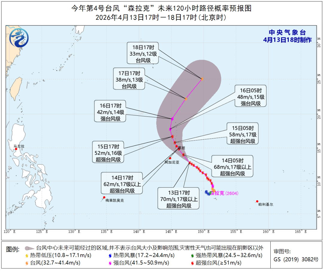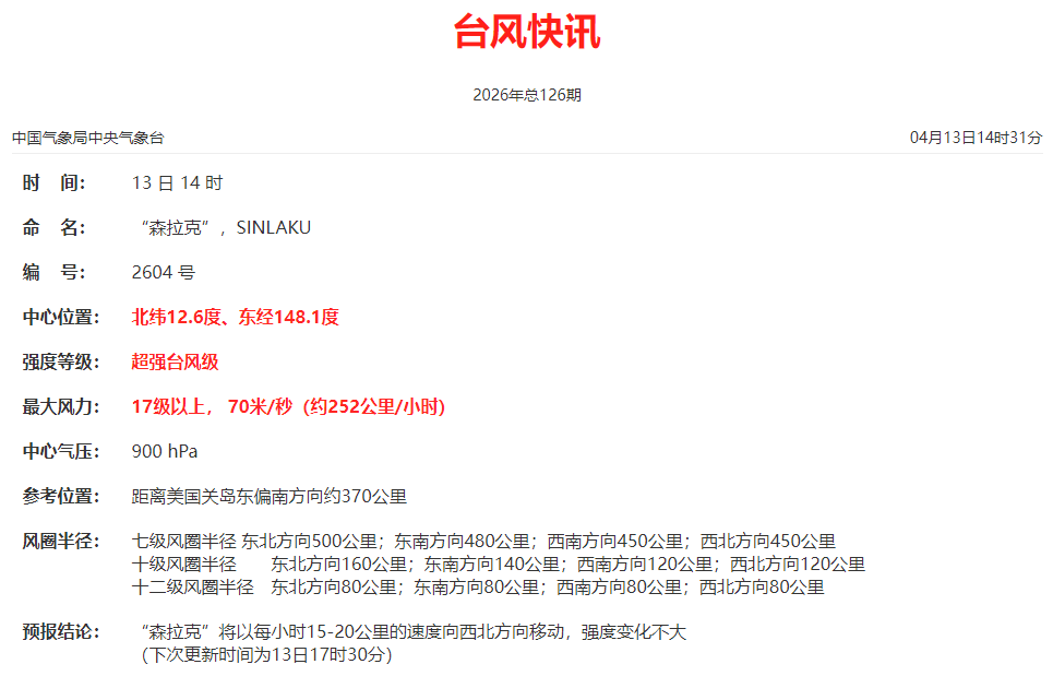 今天,西北太平洋上的台风“森拉克”中心隔邻最大风力达到70米/秒(17级以上),中心最低气压为900百帕,这强度,十足称得上是4月台风界的“据说”。