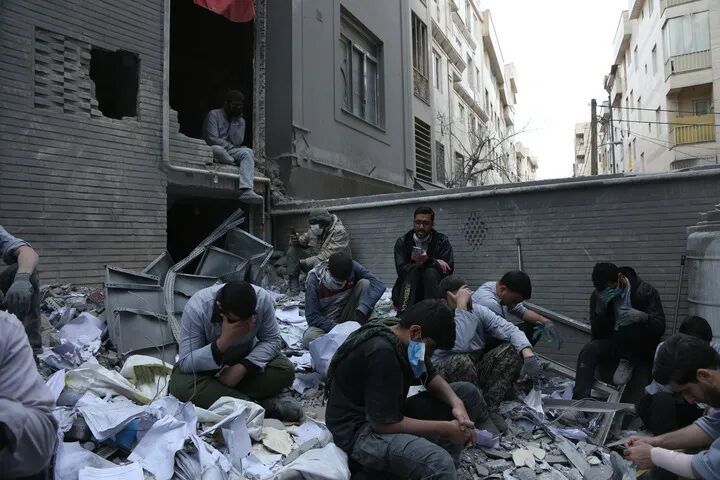 3月15日,在伊朗齐门德黑兰的一处遇袭住户区,东说念主们坐在一处建筑废地上。新华社记者 沙达提 摄