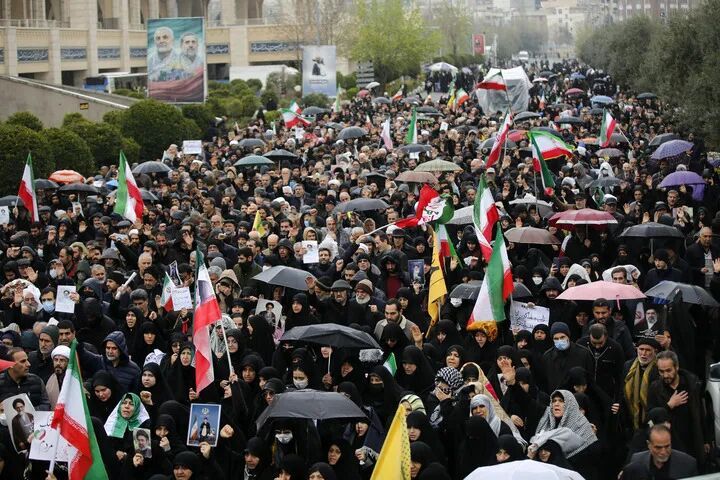 3月20日,在伊朗齐门德黑兰,东说念主们参加伊朗谍报部长伊斯梅尔·哈提卜过甚家东说念主的遗体告别庆典。新华社发