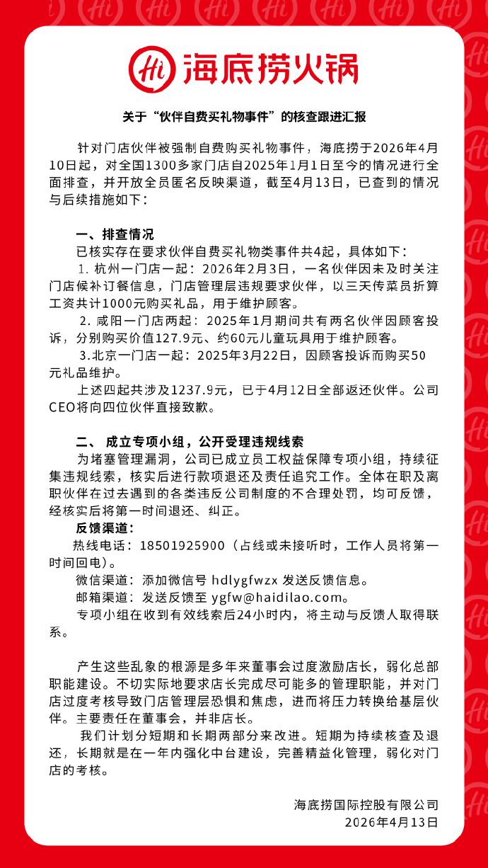 4月13日,海底捞暖锅发布《对于“伙伴私费买礼物事件”的核查跟进陈诉》: 针对门店伙伴被强制私费购买礼物事件,海底捞于2026年4月10日起,对寰宇1300多家门店自2025年1月1日于今的情况进行全面排查,并怒放全员匿名反应渠说念,截止4月13日,已查到的情况与后续要领如下: 一、排查情况 己核实存在条目伙伴私费买礼物类事件共4起,具体如下: 1.杭州一门店一齐:2026年2月3日,又名伙伴因未实时柔和门店候补订餐信息,门店处置层非法条目伙伴,以三天传菜员折算工资以为1000元购买礼品,用于...