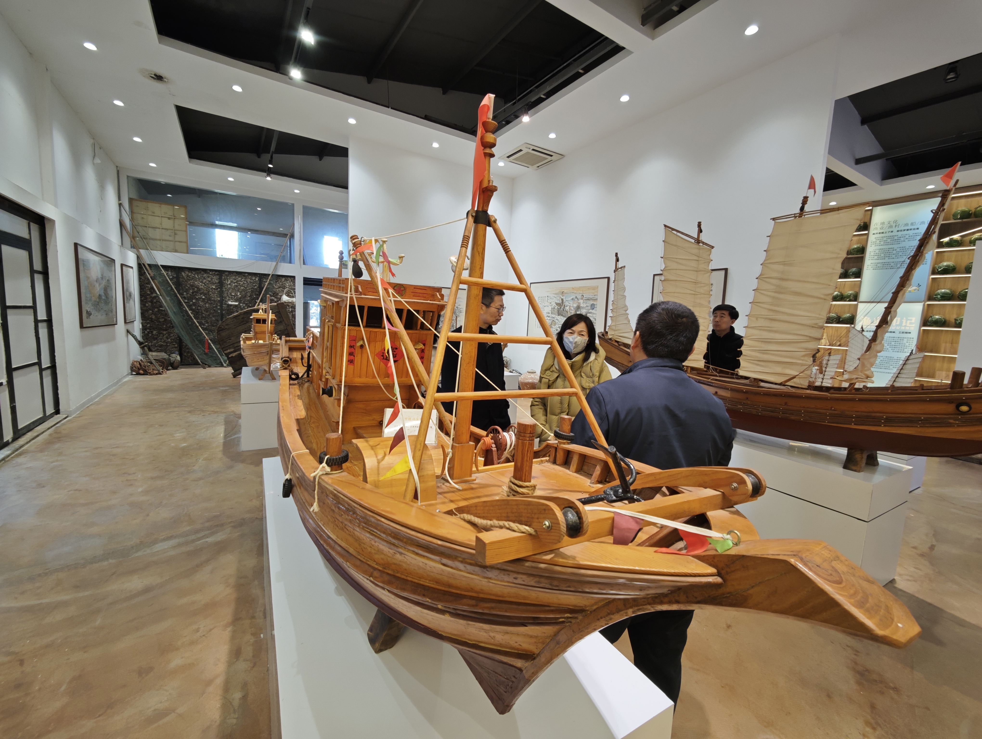 ▲旅客在日照市的海洋主题民宿抚玩体验传统渔船制造身手